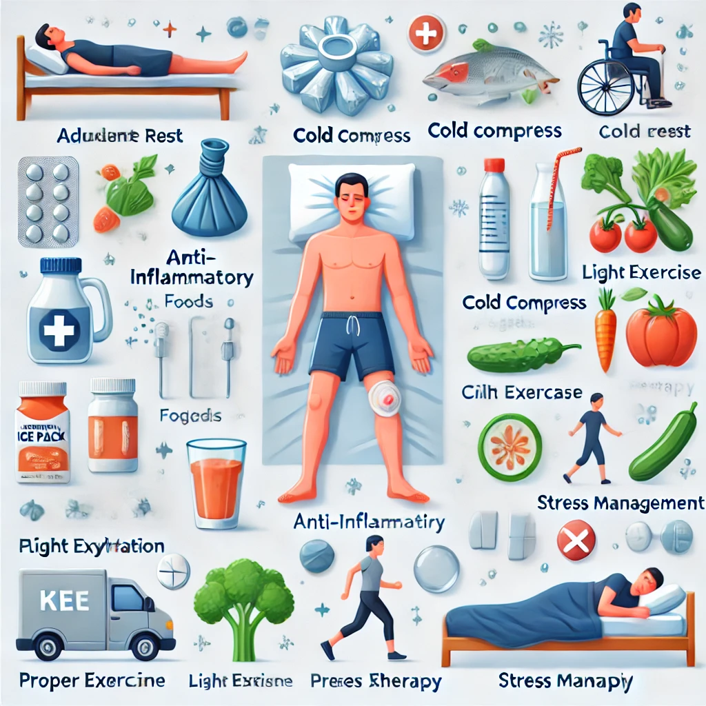 - 가벼운 운동: 적절한 운동은 체액 순환을 촉진하고 염증을 줄이는 데 도움이 됩니다. 걷기, 스트레칭, 수영 등은 부드럽게 몸을 움직여 염증 부위를 자극하지 않으면서도 혈류를 개선할 수 있는 좋은 운동입니다. 운동을 통해 근육을 강화하고 유연성을 유지하는 것도 중요합니다.