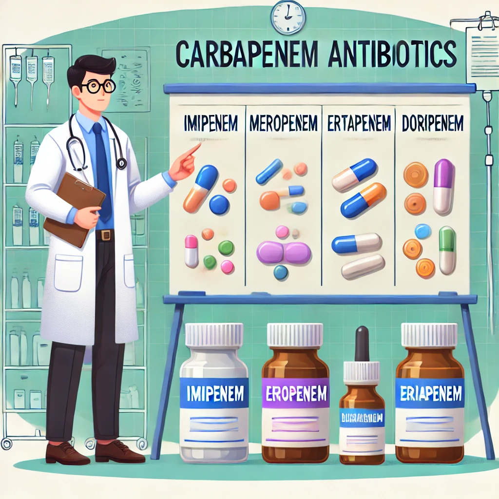 카바페넴 계열에는 여러 종류가 있으며, 각 항생제는 특정한 감염 유형에 대해 더 효과적일 수 있습니다. 여기서는 가장 널리 사용되는 카바페넴계 항생제의 주요 종류를 소개하겠습니다.