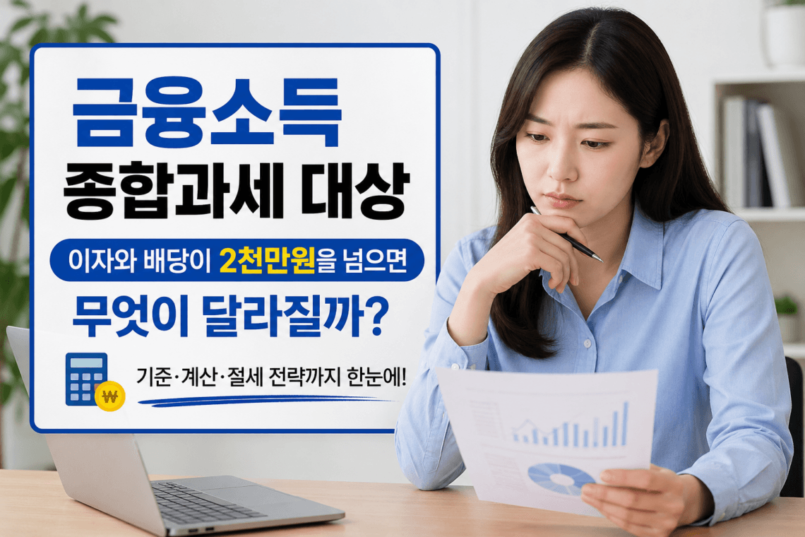 예금 이자, 적금 이자, 채권 이자, 국내외 배당금, 펀드 분배금처럼 금융상품에서 생기는 소득이 커지면 많은 분들이 가장 먼저 걱정하는 것이 바로 금융소득 종합과세 대상이 되는지입니다. 특히 은행 금리가 높아졌거나 배당주 투자를 오래 해 온 분들, 퇴직금이나 목돈을 예금·채권·배당형 상품에 나누어 넣어 둔 분들은 어느 순간 “이자와 배당을 합치면 2천만원이 넘을 수도 있다”는 이야기를 듣고 세금 부담이 갑자기 커지는 것은 아닌지 불안해하시는 경우가 많습니다.