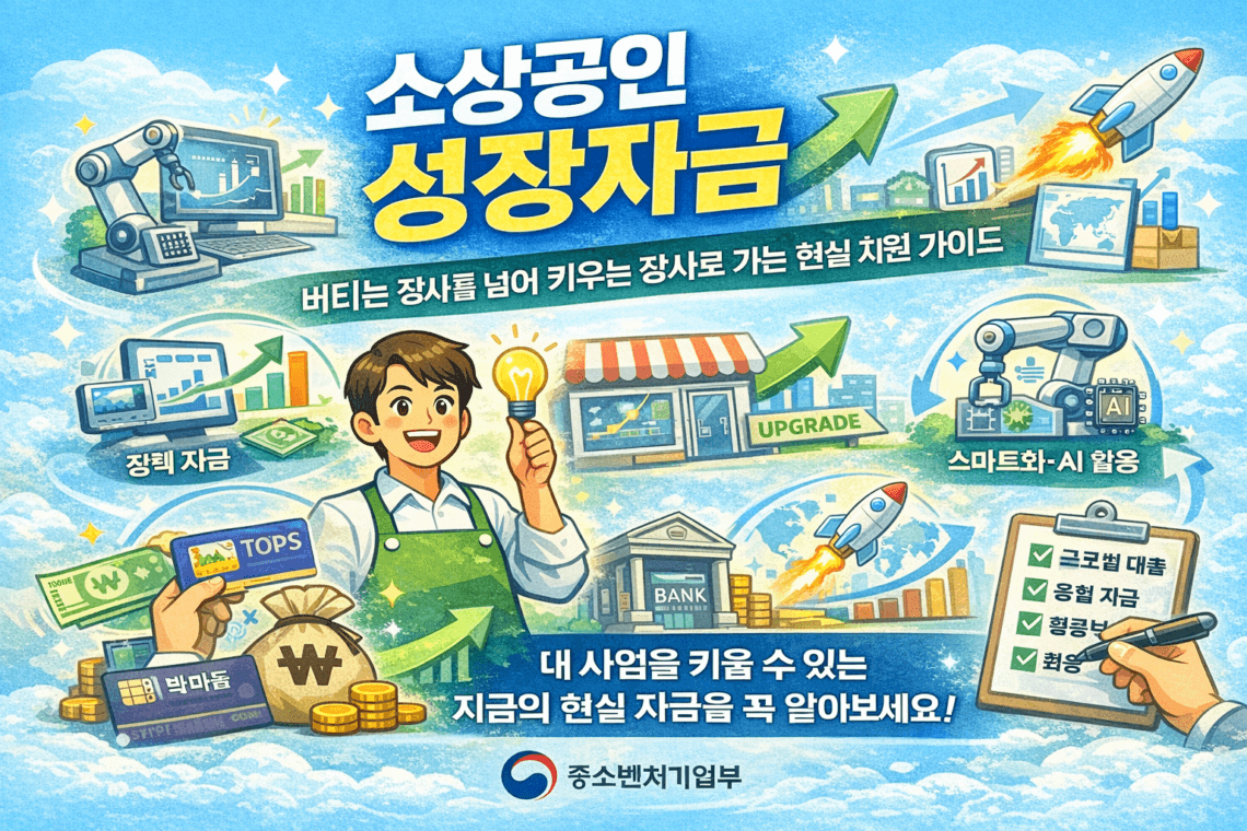소상공인에게 가장 어려운 시기는 매출이 떨어졌을 때만이 아니라, 반대로 기회가 왔는데도 자금이 부족해 그 기회를 잡지 못하는 순간이기도 합니다. 손님이 늘고, 제품 반응이 좋아지고, 온라인 주문이 붙기 시작했는데도 설비를 늘리지 못하고, 마케팅에 투자하지 못하고, 디지털 시스템을 붙이지 못하면 분명히 성장 가능성이 있는데도 다시 제자리로 돌아가는 일이 많습니다. 그래서 성장자금은 단순히 돈을 빌리는 문제가 아니라, 작은 가게가 더 큰 사업으로 넘어가는 다리를 놓는 역할을 한다고 보셔야 합니다. 최근 중소벤처기업부도 소상공인 정책을 발표하면서 안전망 강화와 함께 유망 소상공인의 성장 촉진, AI·디지털 전환, 브랜드 육성, 글로벌 진출을 중요한 축으로 제시했습니다.