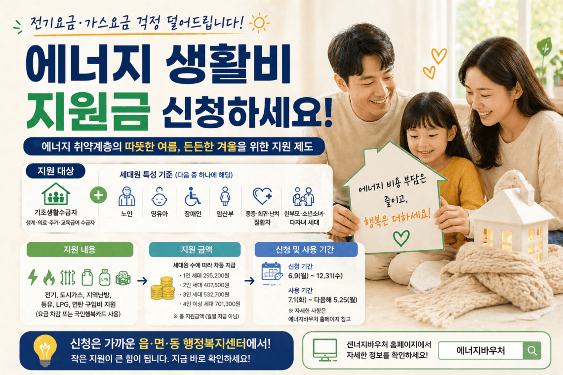 에너지 생활비 지원금은 전기, 도시가스, 지역난방, 등유, LPG, 연탄 같은 에너지 비용을 줄여주는 대표적인 복지 제도입니다. 현금으로 자유롭게 쓰는 일반 생활비 지원금이 아니라, 에너지 취약계층이 냉방비와 난방비 부담을 줄일 수 있도록 지원하는 바우처 제도라는 점을 먼저 이해해야 합니다.