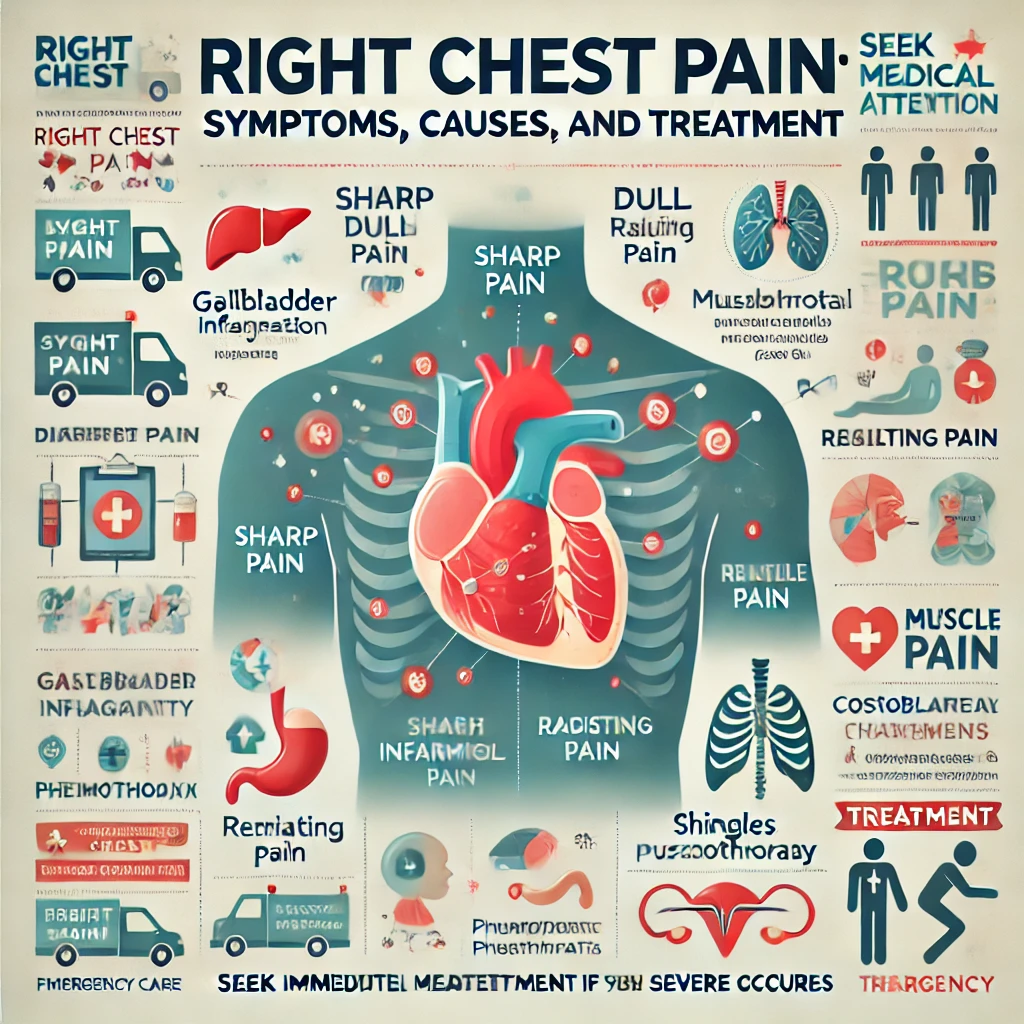 - 대상포진: 바이러스 감염으로 인해 발생하는 통증으로, 주로 피부 발진과 함께 나타납니다. 신경을 따라 통증이 퍼지며, 오른쪽 가슴 부위에 통증이 집중될 수 있습니다.