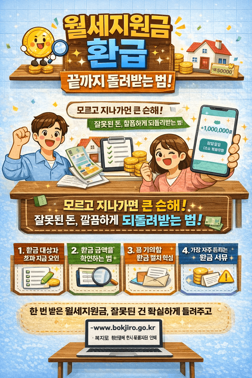 그래서 오늘은 “월세지원금 환급”을 세 가지 갈래(받는 환급 / 밀린 지급 / 돌려주는 반환)로 딱 나눠서, 지금 내 상황이 어느 쪽인지 먼저 진단하고, 그 상황별로 어떤 행동을 해야 돈의 흐름이 끊기지 않는지까지 길게, 그리고 실무적으로 정리해드리겠습니다.