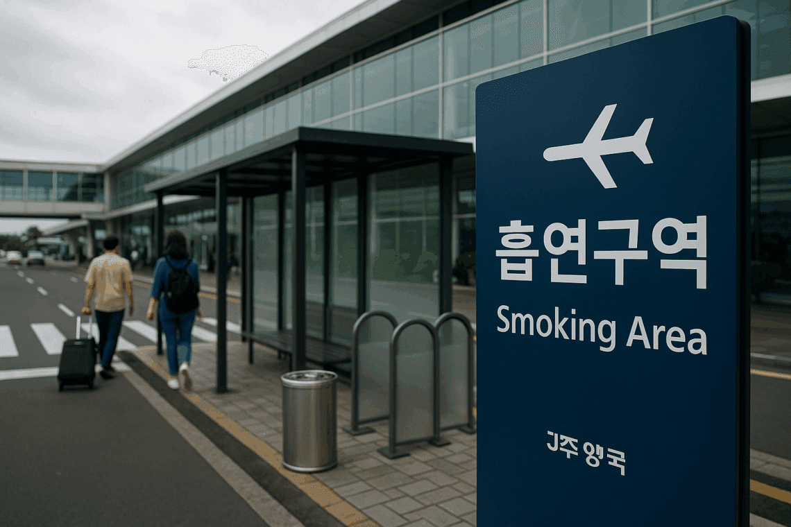 현장 확인 요령: 공항 동선 곳곳에 ‘흡연구역(Smoking Area)’ 표지와 화살표, 노면 안내가 있으니 표지판 → 외부 출구 → 횡단보도 순으로 이동하면 빠릅니다. 비·바람이 잦은 제주 특성상 방풍막·캐노피가 있는 부스를 우선 찾으세요. ALL of JEJU(AOJ)