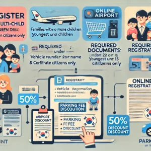 인천국제공항에서 다자녀 할인 등록 절차를 자세히 설명하겠습니다: 1. 대상 확인 대상: 두 자녀 이상 가정, 막내가 15세 미만. 국적: 한국 국적자. 2. 필요 서류 차량 등록증: 부모 또는 직계 존속자 명의. 주민등록등본: 가구…